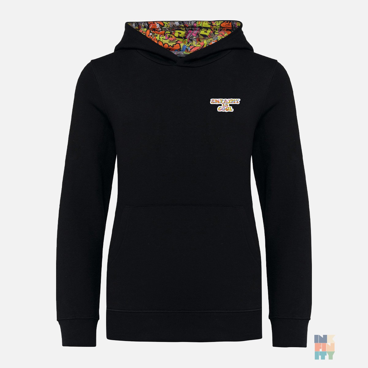 Kids Hood Model Hoodie Empathy is Cool Kariban: Crafted with precision, it comprises 80% cotton and 20% polyester, offering a perfect balance of softness and durability at 280 g/m2. With a Slim Fit cut and straight-stitched sleeves, this hoodie provides a modern and comfortable fit. The pouch pocket adds a practical touch, while the crescent patch at the back of the neck enhances both aesthetics and brand detailing. Elastic cuffs and waist ensure a snug feel, and the hood, lined with Street Graffiti material and contrast cord, adds a playful touch to the design. For added convenience, the removable label allows for a personalized touch. Imported and meticulously printed/embroidered and processed in Romania -Brand: Kariban -Material: 80% cotton, 20% polyester, 280 g/m2 -Children's sweatshirt, Slim Fit cut -Straight stitched sleeves -Pouch pocket -Crescent patch at the back of the neck -Elastic cuffs and waist -Hood lined with Street Graffiti material and contrast cord -Removable label -Imported product, printed/embroidered and processed in Romania