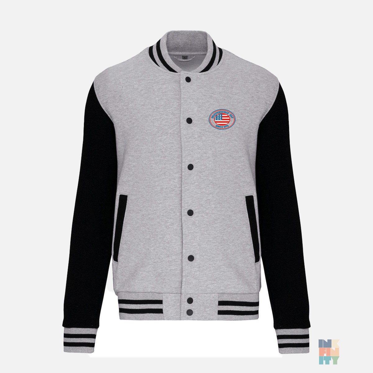Jachetă Varsity Unisex Patriotic America Holiday Embroidery Just Hoods: Închiderea împodobită cu capse contrastante adaugă o notă de rafinament acestei jachete periate. Cu cârlige în spatele gâtului, combină caracterul practic și stilul. Grosimea materialului de 330 g/m2 asigură atât căldură, cât și durabilitate. Fabricat din 70% bumbac la exterior și 30% fleece la interior, oferă o senzație confortabilă și elegantă. Certificarea WRAP subliniază angajamentul său față de fabricarea etică. Importată și atent imprimată/brodata și prelucrată în România.